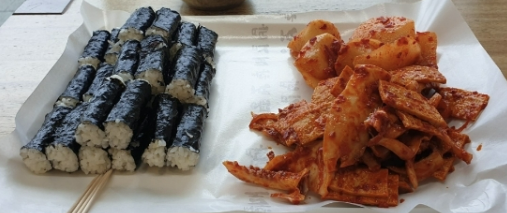 김밥 자체는 담백하고, 새콤한 무김치와 매콤한 오징어무침이 밥의 심심함을 잡아줍니다.
